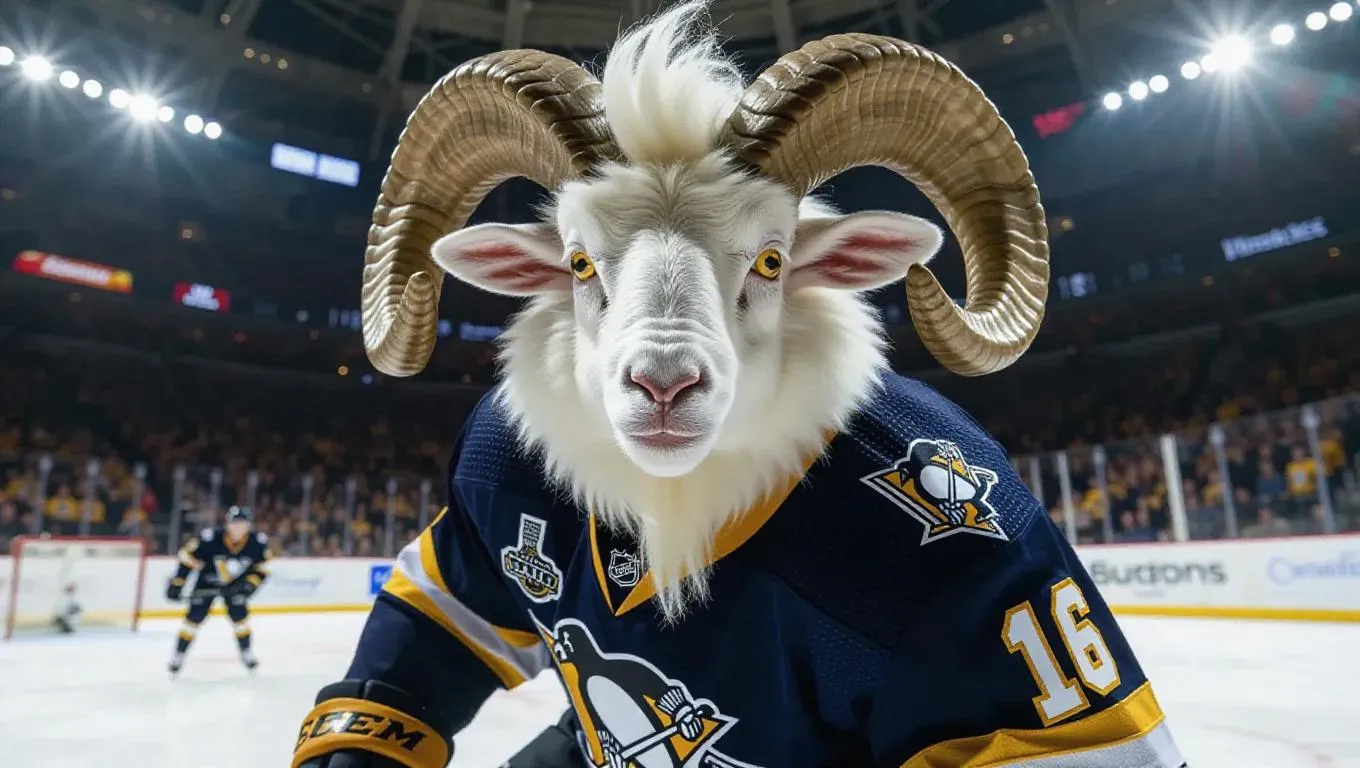 An anthropomorphic ram with gold eyeballs, sporting a pompadour hairstyle and an ice hockey uniform, featuring cream-colored fur and a fierce expression, captured in stunning 8K resolution, exuding power and enthusiasm. The scene is set on an ice rink, with the ram preparing to shoot the puck, the audience ready for action.