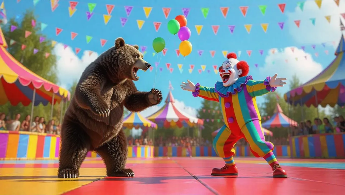 In a colorful carnival sports arena, a bear and a clown are engaged in a friendly game of balloon popping. The bear's strength and power allow it to stomp balloons, while the clown's agility and speed help it to juggle and toss fast. The vibrant carnival atmosphere enhances the intensity of the game between the bear and clown.