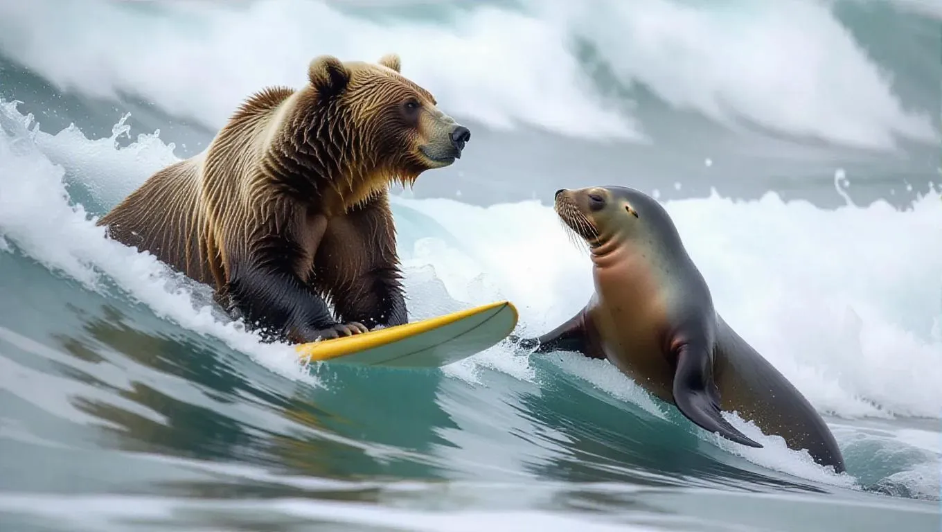 In a stormy coastal sports arena, a bear and a sea lion are engaged in a friendly game of surfing. The bear's strength and power allow it to ride the waves valiantly, while the sea lion's agility and speed help it to maneuver gracefully. The roaring ocean enhances the intensity of the game between the bear and sea lion.