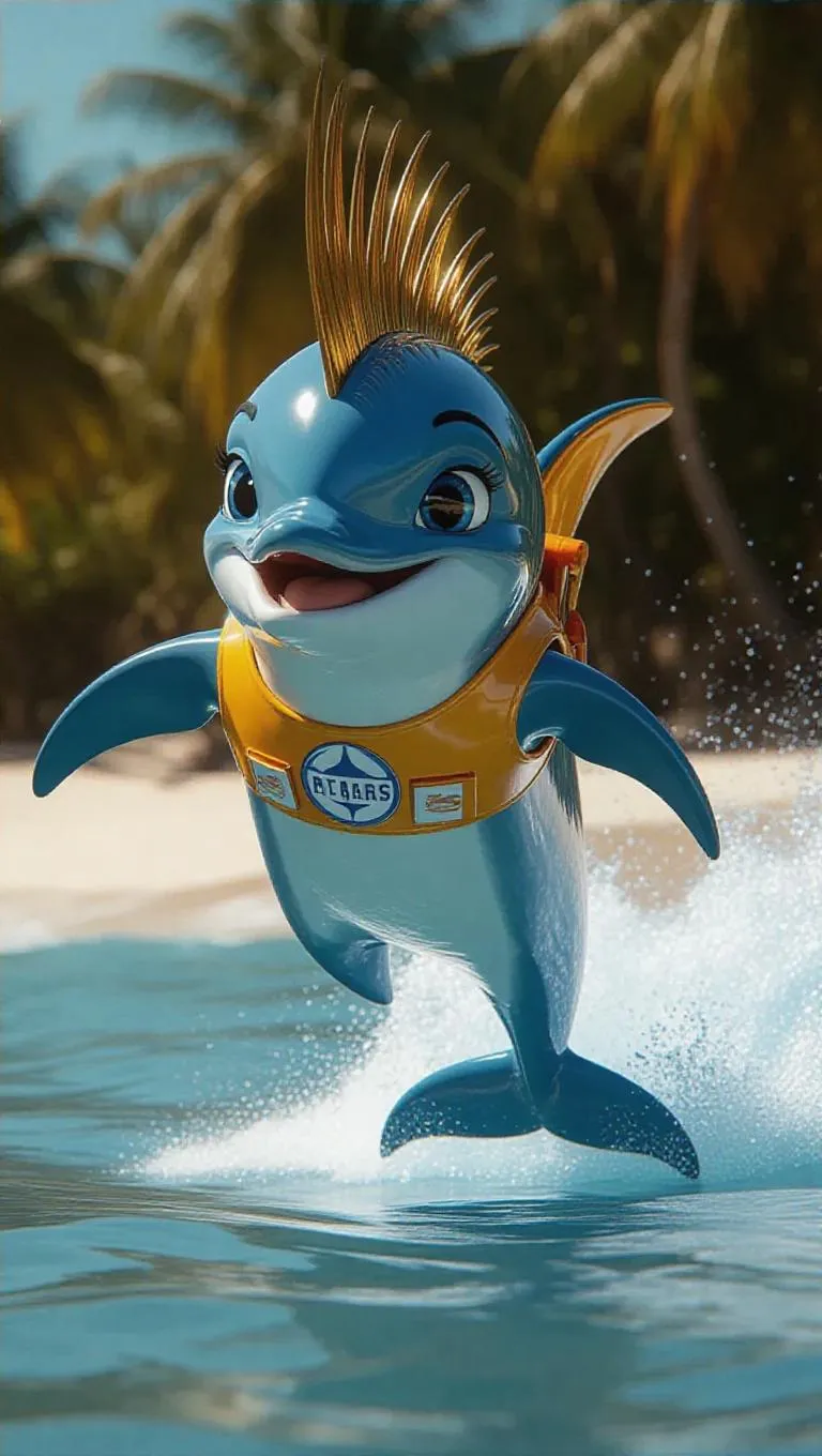An anthropomorphic dolphin with golden fins, sporting a mohawk hairstyle and wearing a lifeguard outfit, featuring blue skin and a cheerful expression, captured in stunning 8K resolution, exuding playfulness and energy. The scene is set at a tropical beach, with the dolphin jumping over a wave and splashes flying in the air.