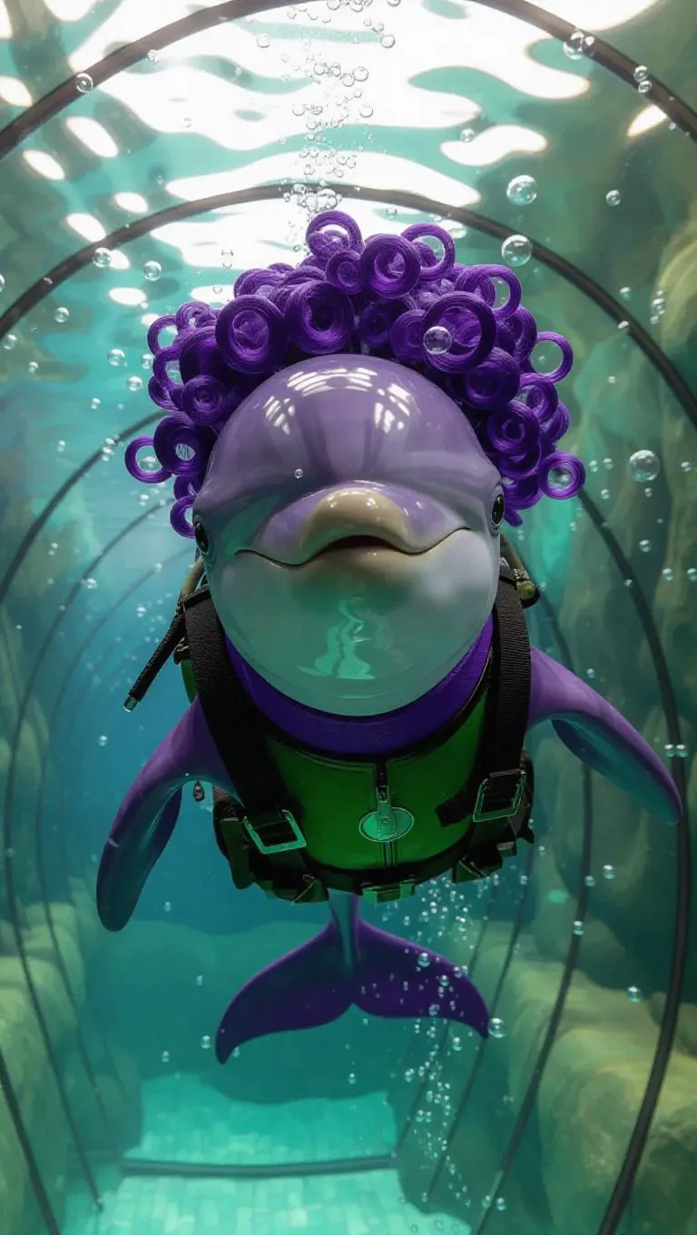 An anthropomorphic dolphin with purple scales, sporting a curly hairstyle and a diving suit, featuring green skin and a surprised expression, captured in stunning 8K resolution, exuding excitement and thrill. The scene is set at an aquarium, with the dolphin swimming through a tunnel and bubbles rising around.