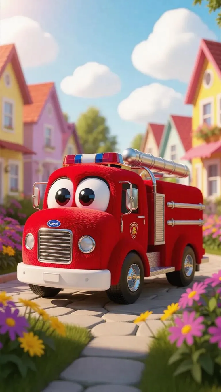 A fluffy, Jellycat-style fire truck with soft, rounded edges and large, expressive eyes is parked beside a vibrant flower garden in a cheerful, brightly-colored town. Its body is covered in plush, red fur, with white paws and a tiny, adorable water hose on top. The clear blue sky above is dotted with fluffy clouds, and soft, warm sunlight filters through, casting gentle shadows and highlighting the truck's cuddly texture. The scene exudes a playful, whimsical charm, perfect for a children's storybook.