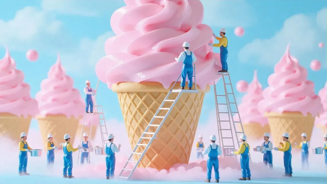 A group of miniature workers in aprons and safety hats is laboring within a gigantic ice cream cone. Some are mixing flavors with oversize mixers, while others freeze ingredients on a miniature assembly belt, as cold fog drifts like fumes. The scene resembles a thriving ice cream factory, with ladders and structures supporting the cone.