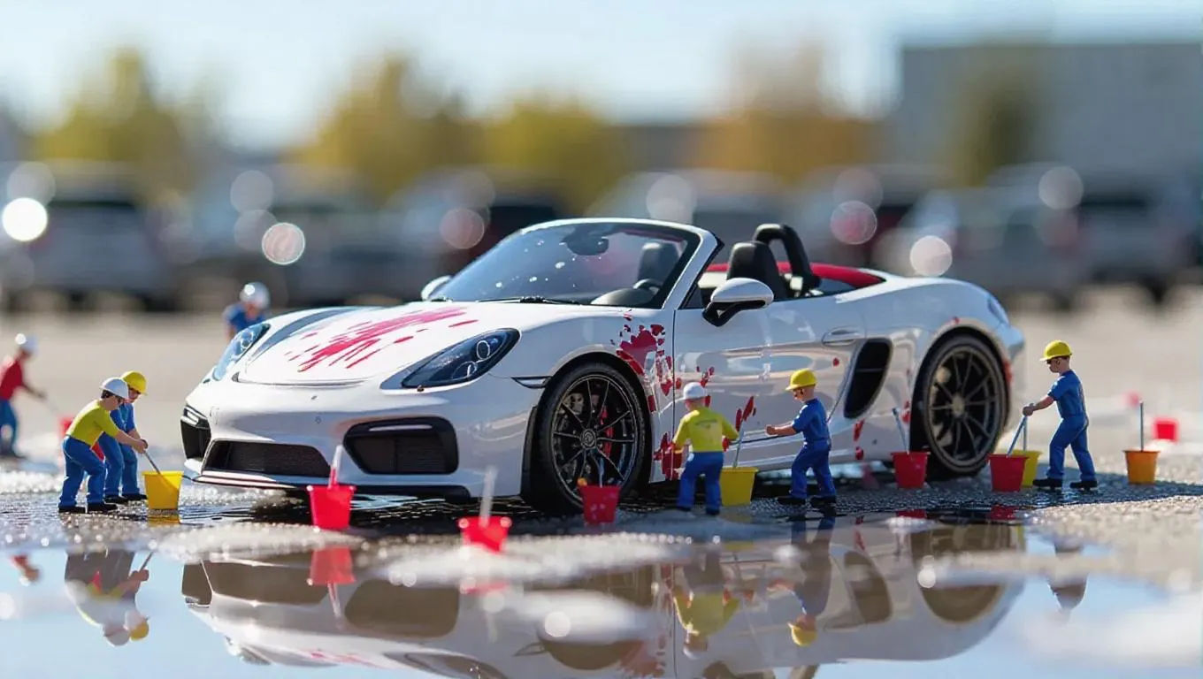A group of tiny, thumb-sized workers is diligently cleaning a sporty white convertible, which is the centerpiece of the image. The car is parked on a smooth surface, possibly a car dealership or showroom, and has red splatters on its side, indicating that it has been recently washed or sprayed. The miniature workers are scattered around the vehicle, some standing closer to it while others are further away. They appear to be focused on their task, using tiny buckets and sponges to scrub and rinse the vehicle. The surrounding environment is dominated by a sunny midday sky, which casts a bright, cheerful light over the scene. There are no other objects or people visible in the image, and no text or distinctive markings are present.
