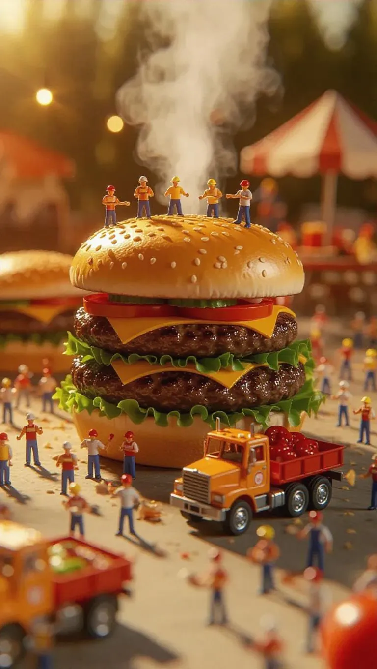 A bustling culinary construction site where an enormous burger is being assembled by thumb-sized workers. A miniature truck carefully delivers a fresh bun, while small chefs layer lettuce and tomato with tiny tools. Some workers stack patties like building blocks, while others squeeze ketchup from miniature bottles. Steam rises gently, hinting at the sizzling goodness, while the blurred background reveals a lively barbecue with grills and picnic tables nearby.