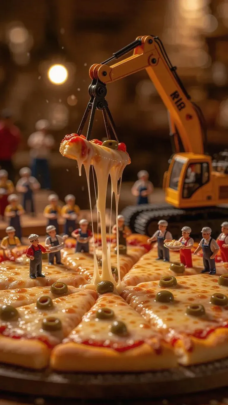 A jovial construction site where a gigantic pizza is being assembled by thumb-sized chefs. A miniature crane lifts slices of cheese into place, while tiny bakers scatter toppings with small scoops. Some workers arrange olives like beads, while others carefully splash tomato sauce from tiny cans. The savory scent of baked dough lingers in the air, while the soft focus background highlights an inviting pizzeria filled with delicious aromas and cheerful patrons.