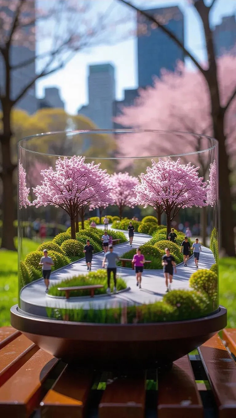 The modern city park with lush greenery and a winding jogging path filled with runners comes to life as the camera pans across the landscape, all contained within a glass cube on a bench. The blooming cherry blossoms surrounding the base of the large, circular platform sway gently in the spring air, adding a refreshing, seasonal touch to the miniature park. The park is designed in a contemporary urban style, with sleek benches and paths enhancing the experience of nature in the city.