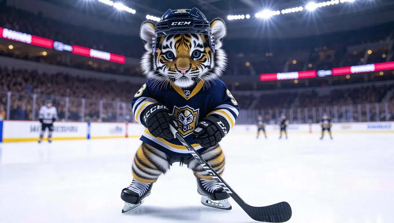 A 6-month-old, healthy tiger cub stands confidently on a competitive ice hockey rink, adorned in an eye-catching hockey jersey and a dazzling helmet. Its fluffy coat glows under the arena lights, giving it an adorable yet fierce look. The ice gleams brightly, with the cheers of the vibrant crowd in the background boosting the atmosphere. The cub raises a mini hockey stick, ready for action.