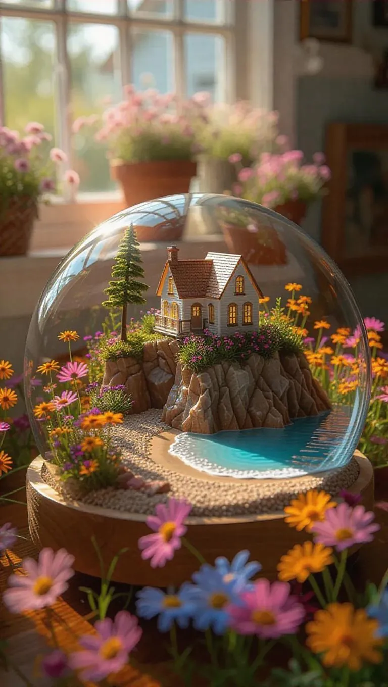 The quiet coastal town with quaint cottages and a sandy beach comes to life as the camera tilts across the scene, all contained within a transparent glass box on a table. The vibrant wildflowers surrounding the base of the large, circular platform sway gently in the spring breeze, adding a colorful, seasonal glow to the miniature seaside landscape.