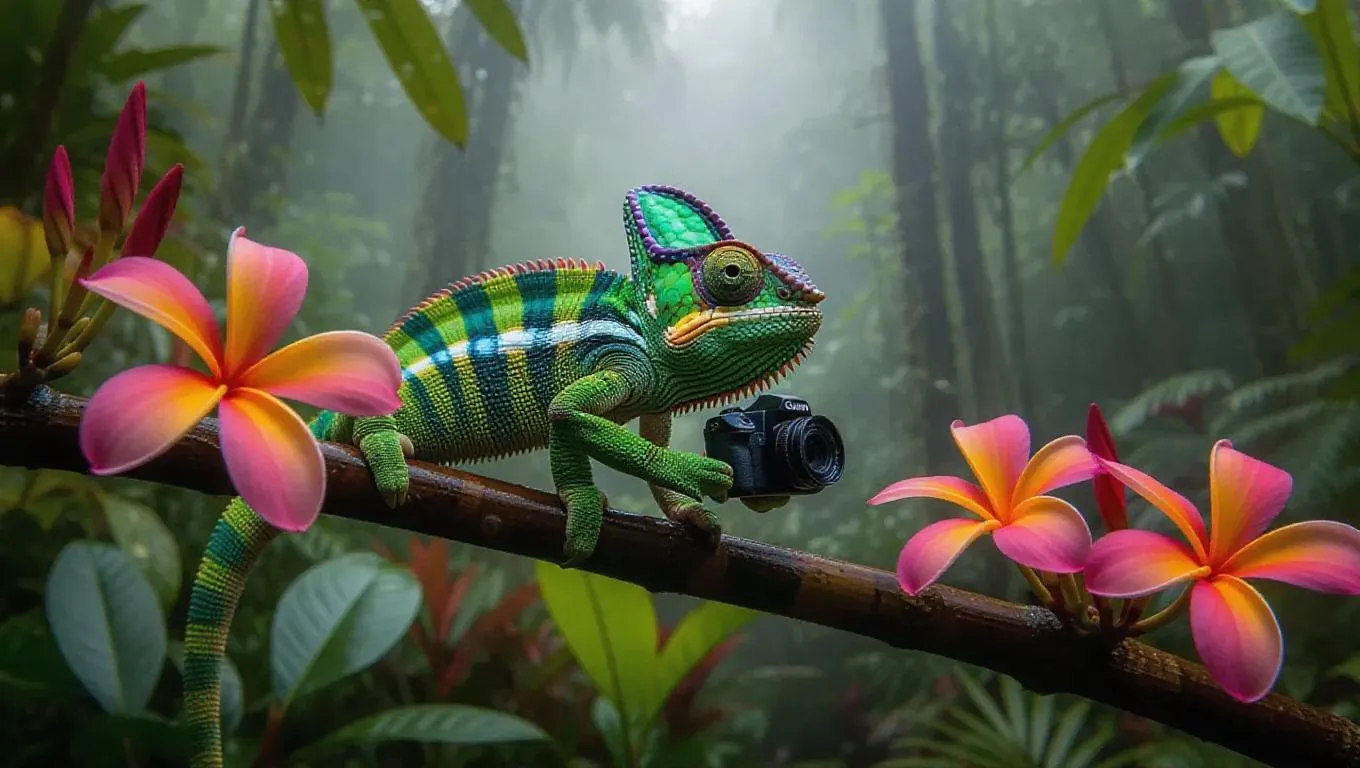 An adventurous chameleon climbs playfully on a branch, blending with colorful flowers in a rainforest. The chameleon, with its changing colors, holds a tiny camera in its hands. The rainforest bursts with vibrant greenery and wildlife. In the background, a mist rises above the trees, creating a mystical atmosphere, with the sounds of the jungle echoing all around.