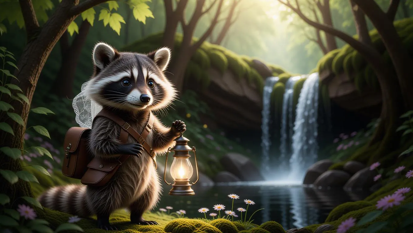 A curious raccoon stands at the edge of a fairy-tale forest, holding a glowing lantern in one paw. The raccoon wears a brown satchel and a delicate veil. Behind it, whimsical trees stretch into the bright sky, their leaves swirling in a magical breeze. In the distance, a hidden waterfall pours into a sparkling pool, its mist creating a spectacle in the air. The forest floor is covered in vibrant moss and fairy-like wildflowers, adding a touch of whimsy to the scene.