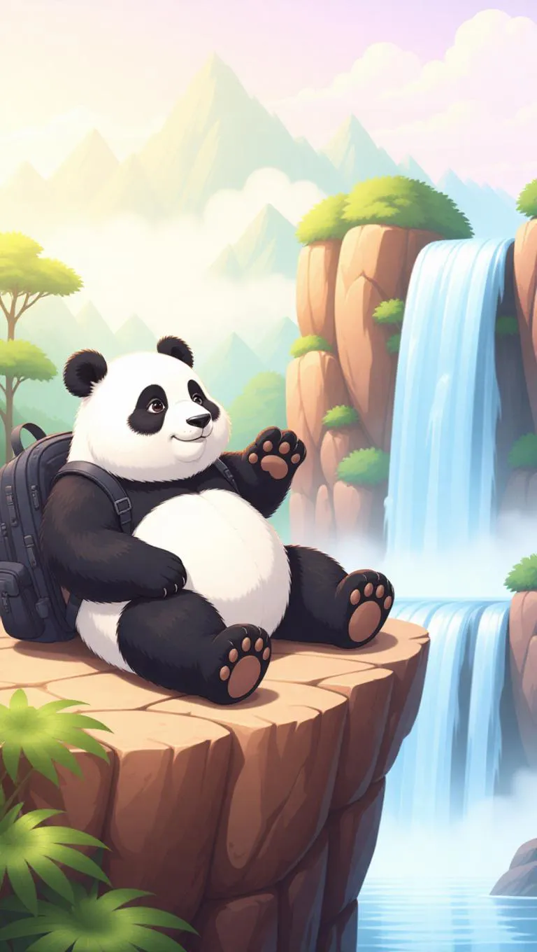 A cartoon panda lounges lazily on a rocky cliff, holding a black backpack. A waterfall cascades down into a lush valley. The waterfall, sparkling in the sunlight, symbolizes rejuvenation. The sky above is painted in soft pastels, suggesting an early morning, with fog rolling over the hills.