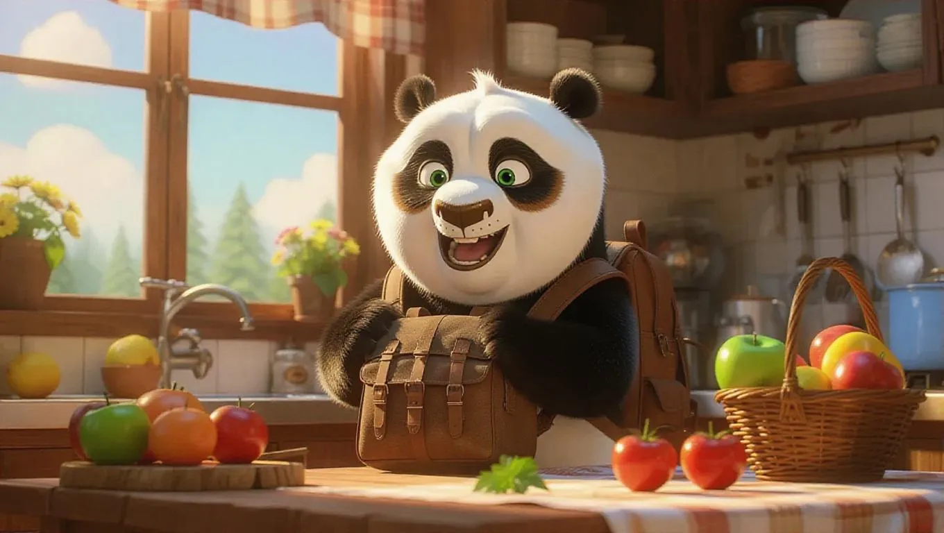 A cartoon panda cooks cheerfully in a cozy kitchen, holding a brown backpack. A colorful fruit basket decorates the table. The fruit, fresh and healthy, showcases culinary delights. The sky outside the window is painted in soft azure, suggesting a lovely afternoon, with sunlight pouring in.