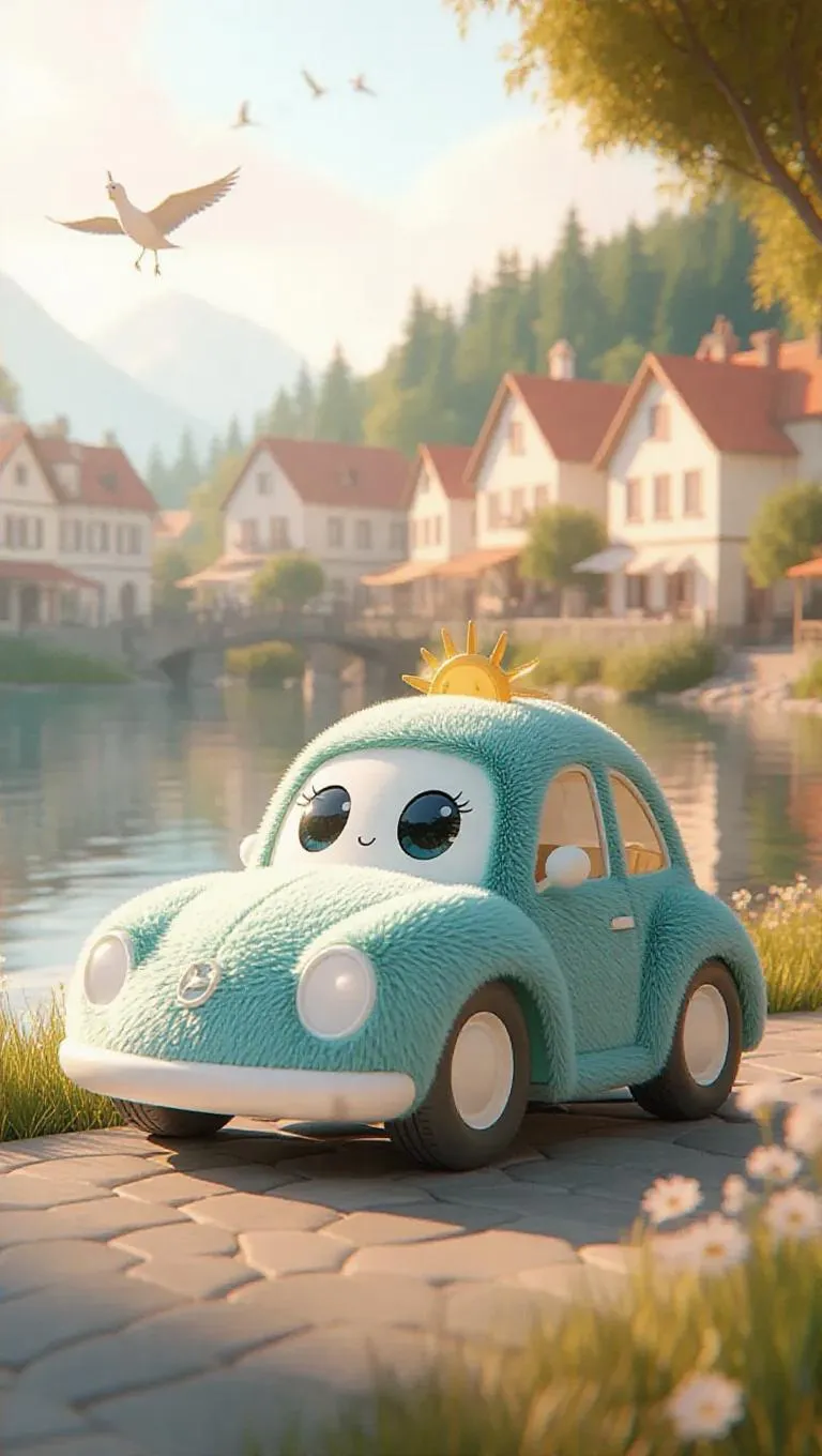 A playful, Jellycat-style convertible with soft, rounded edges and large, delightful eyes is parked beside a sparkling lake in a serene, pastel-colored town. Its body is covered in plush, seafoam green fur, with white paws and a tiny, endearing sunroof on top. The bright morning sky above is alive with birds, and soft, warm sunlight filters through, casting soft shadows and enhancing the car's cuddly texture. The scene radiates a peaceful, lively charm, perfect for a children's storybook.