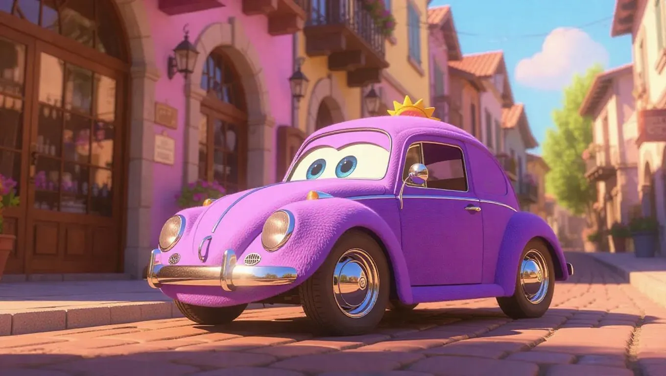 A delightful, Jellycat-style convertible with gentle, rounded edges and happy, bright eyes is parked beside a quaint antique shop in a charming, pastel-colored town. Its body is covered in plush, soft purple fur, with white paws and a tiny, sweet sunroof on top. The clear blue sky above is occasionally brushed with wisps of clouds, and soft, warm sunlight filters through, casting playful shadows and enhancing the car's inviting texture. The scene emanates a vintage, heartwarming charm, perfect for a children's storybook.