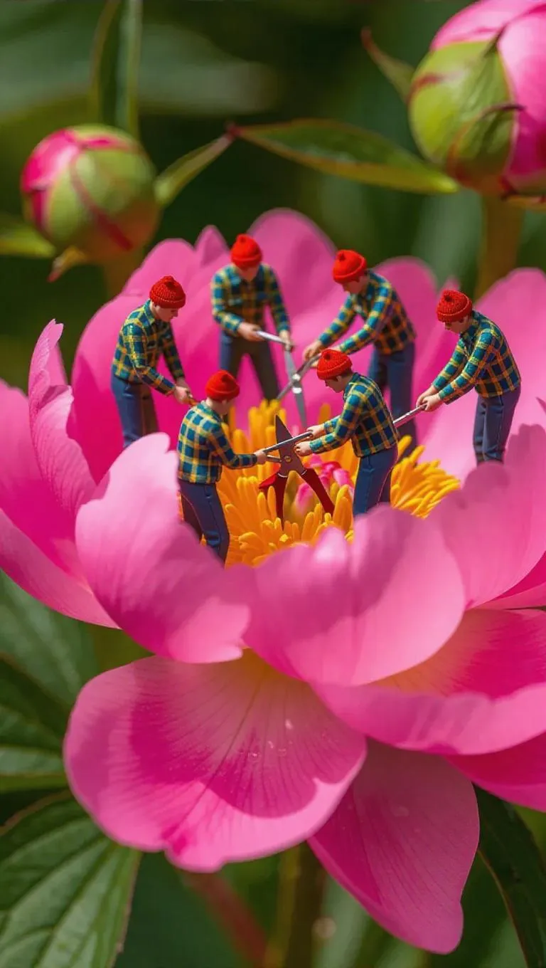 A group of minute figures, clothed in bright plaid shirts and beanies, gather on a flowering peony, carefully trimming its petals with tiny shears. The lush petals and sturdy stems create a captivating environment, capturing a moment of attention and leisure.