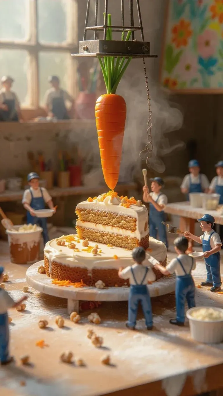 A charming art studio where a giant carrot cake is being created by thumb-sized artists. A miniature lift carefully elevates a new layer of carrot sponge cake, while tiny bakers paint cream cheese frosting with small brushes. Some workers add shredded carrots as decorations, while others sprinkle walnuts from tiny bowls. Steam rises gently, hinting at the creativity of crafted desserts, while the blurred background reveals colorful paintings and art supplies scattered around.
