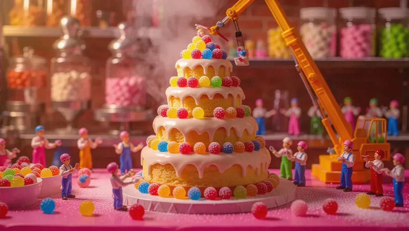 An imaginative candy factory where a towering gumdrop cake is being designed by thumb-sized confectioners. A miniature crane carefully lifts a new layer of sponge cake, while tiny bakers pour brightly colored frosting with small spatulas. Some workers arrange gumdrops as decorations, while others carefully sprinkle sugar crystals from tiny bowls. Steam rises gently, hinting at the sweetness of candy creations, while the blurred background reveals candy machines and jars filled with sweet treats.