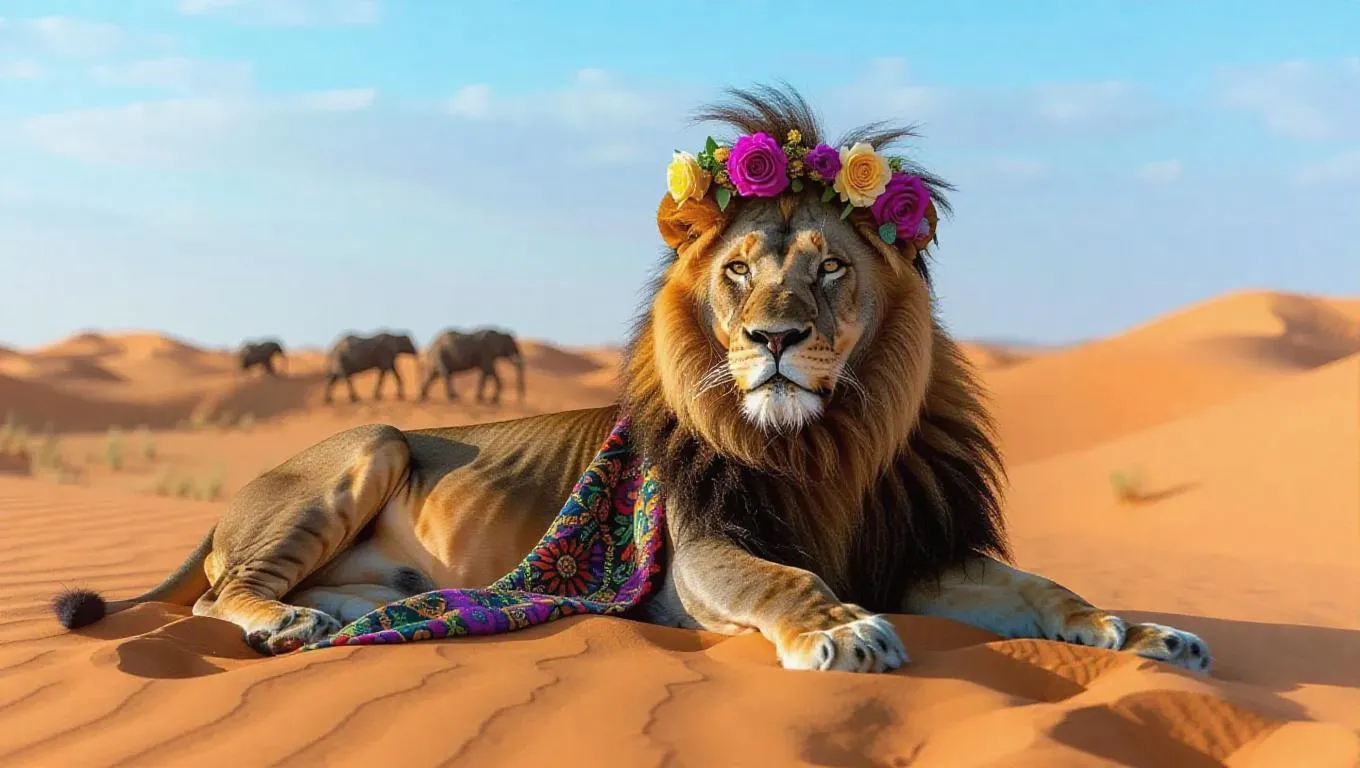 A serene lion rests gracefully in the shadows of the Sahara Desert in Sierra Leone, its flowing mane brushing gently against the sand. The lion is adorned with a delicate floral crown and a flowing shawl decorated with ornate patterns. The dunes behind it paint a picture of tranquility with their rich, golden surfaces barely disturbed by the wind. In the distance, a small group of elephants can be seen, their figures outlined softly against the glimmering backdrop. The sky becomes a palette of blues and whites, adding serenity to the scene.