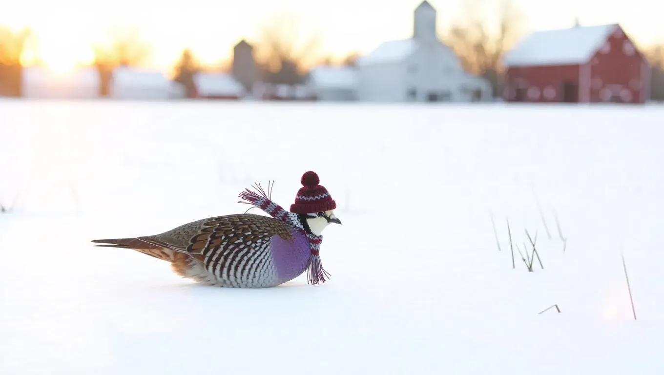 A determined partridge scurries through the frigid fields of Georgia, its body fluffing against the cold. The partridge wears a small knitted cap and a fringe scarf. Behind it, farmhouses dot the landscape, their rooftops blanketed in snow. In the distance, a barn stands out, its red color striking against the white. The sky is a glowing gold, suggesting the sun is setting.
