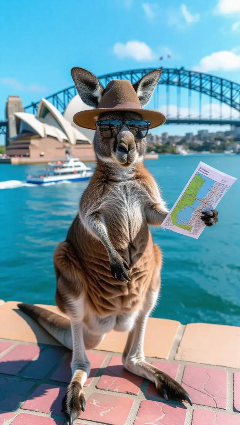 A curious kangaroo hops through the vibrant streets of Sydney, Australia, holding a map in one paw. The kangaroo wears a wide-brimmed hat and a pair of sunglasses, its pouch filled with snacks. Around it, the iconic Sydney Opera House stands out against the blue sky, and the harbor is filled with boats and ferries. In the distance, the Harbour Bridge spans the water, its arches lit by the afternoon sun. The air is filled with the scent of saltwater and the sounds of seagulls.