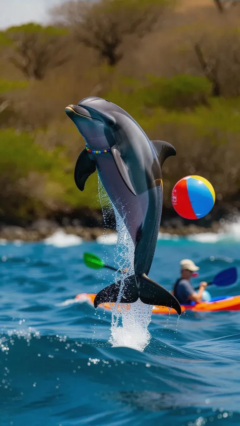 A joyful dolphin leaps through the waves off the coast of the Galápagos Islands, Ecuador, its sleek body shimmering in the mid-morning sun. The dolphin is adorned with colorful beads and a beach ball tucked under its fin, its eyes sparkling with excitement. Around it, rolling waves and vibrant blue waters create a lively backdrop. In the distance, a kayak glides peacefully, its paddles cutting through the surf. The scene is filled with the sounds of splashing.