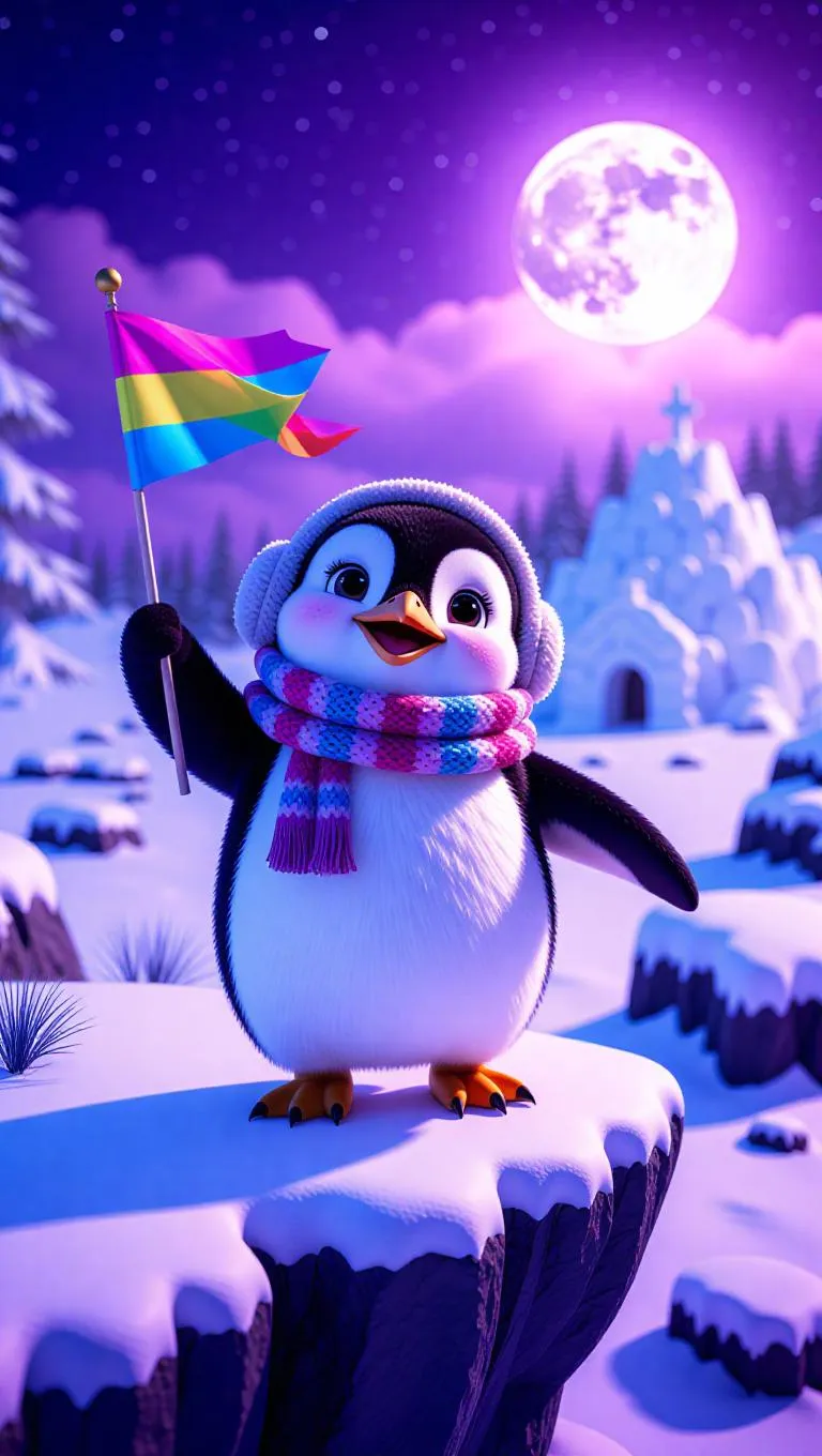 A joyful penguin stands on a rocky cliff, holding a colorful flag in one flipper. The penguin wears a fluffy scarf and earmuffs, its breath visible in the crisp air. Behind it, a frosty landscape extends out, scattered with rocky outcrops and sparkling snowdrifts. In the distance, a large snow fort sits under a bright moon, illuminating the starry sky. The scene is both tranquil and breathtaking.