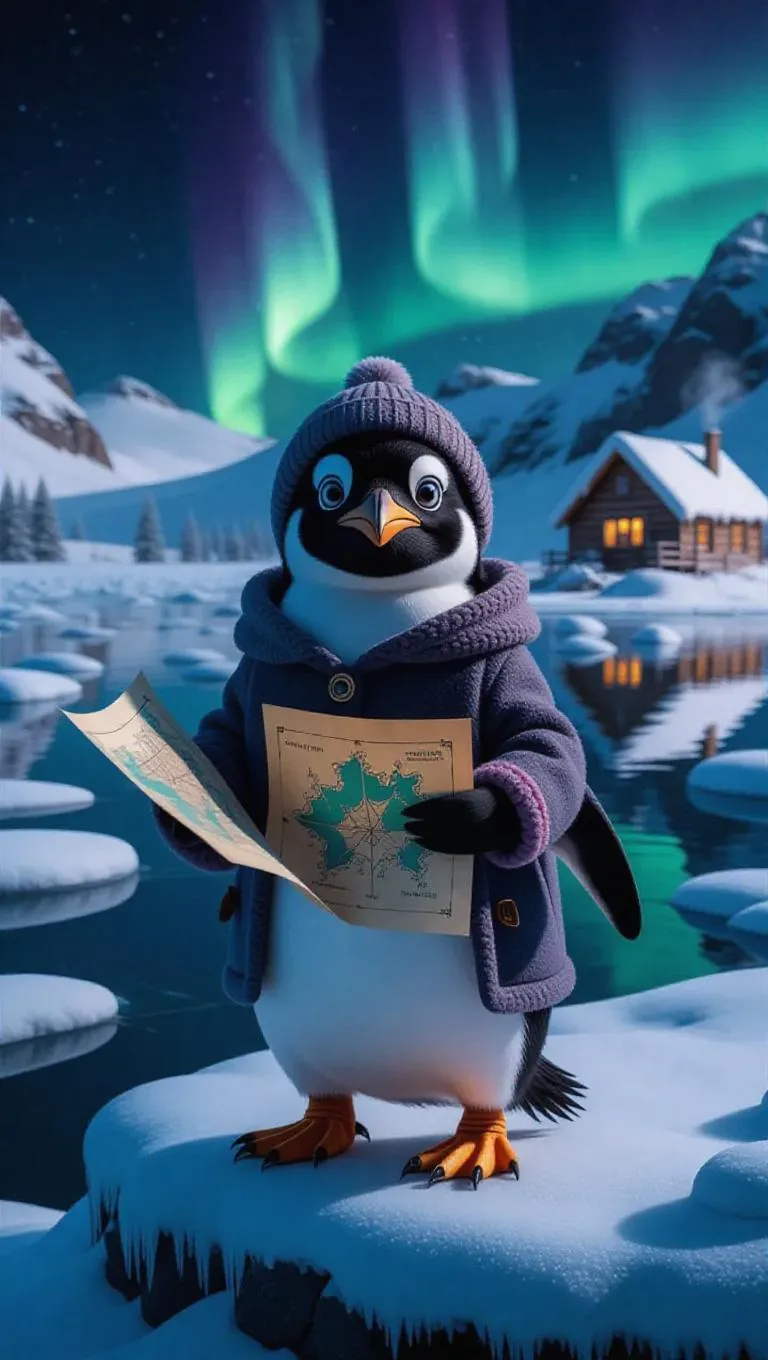 A curious penguin stands on a frosty ledge, holding a treasure map in one flipper. The penguin wears a cozy coat and a warm beanie, its breath visible in the brisk air. Behind it, an expansive frozen landscape lies before it, interspersed with crystal-clear ponds and wind-swept snowdrifts. In the distance, a rustic hut sits beneath swirling auroras, lighting up the dark sky. The scene is both exploratory and captivating.