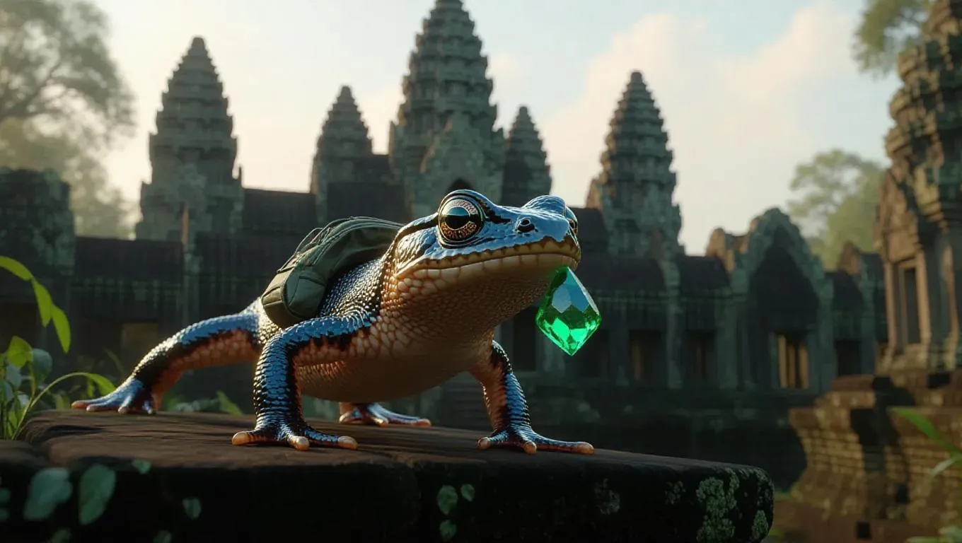 An energetic salamander slithers through the ancient ruins of Angkor Wat in Cambodia, gripping a rare emerald in its mouth. The salamander is adorned with vibrant colors and a small backpack. Surrounding it, detailed stone carvings and towering temples emerge from the jungle, their surfaces lush with plants and vines. In the background, twilight descends, casting an enchanting light over the ruins and the green surroundings. The air is thick with the scent of soil and tales from the past.