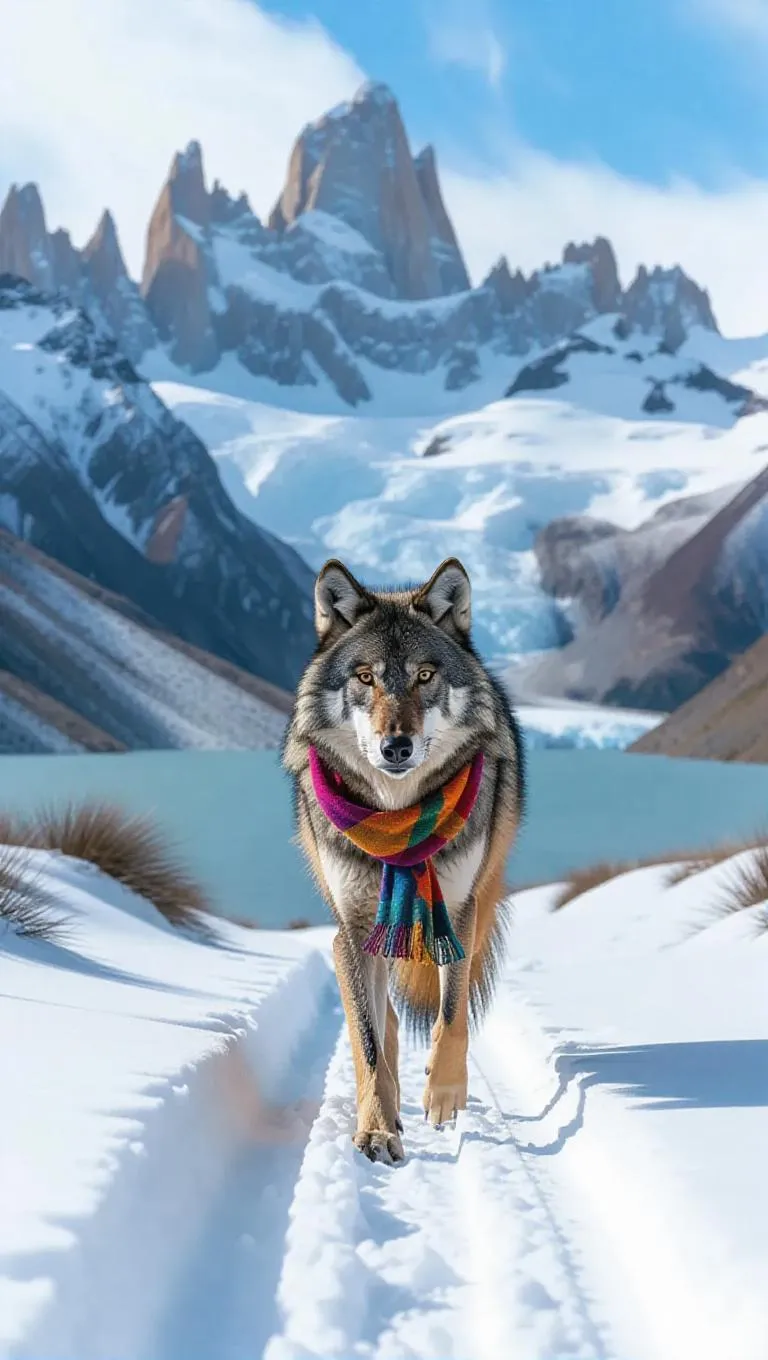 A powerful wolf traverses the rugged terrains of the Andes Mountains, its paws leaving trails in the snow-dusted ground. The wolf is wrapped in a cozy fur coat and a vibrant scarf secured around its neck, its breath visible in the frosty atmosphere. Behind it, towering peaks and icy expanses rise majestically, their surfaces glistening in the sunlight. In the distance, a shimmering lake mirrors the expansive sky, its waters serene and still. The environment is brisk and laced with the essence of pine forests.