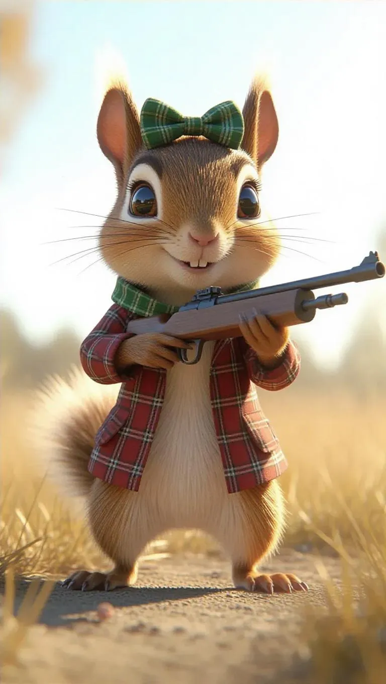 An adorable little squirrel poses in a shooting stance, its green bow neatly on its head. The squirrel wears a red plaid shooting jacket, with bushy ears and nimble paws. It holds a professional air rifle, its eyes sparkling with excitement as it prepares to shoot. The background is an open field shooting range, ensuring the focus remains entirely on the squirrel. The lighting is bright and lively, casting dynamic shadows, enhancing the hyperrealistic, whimsical-style rendering.