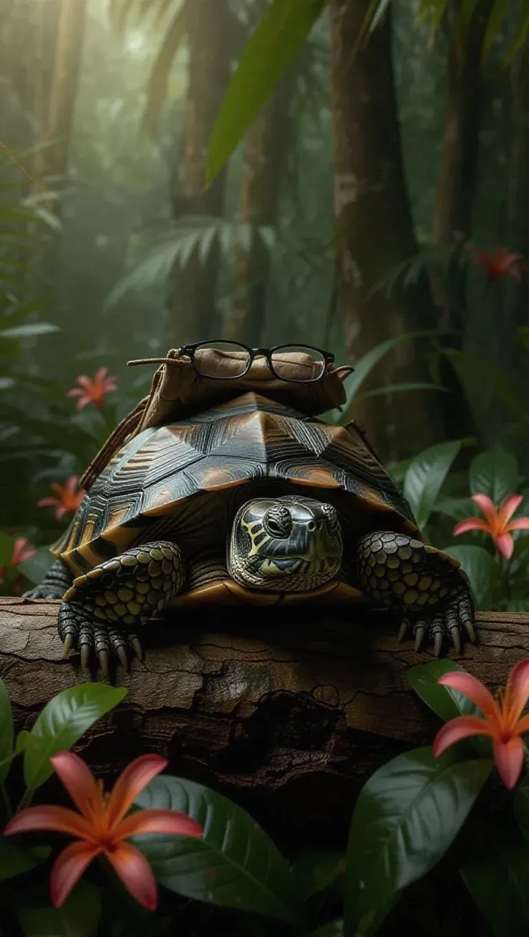 A wise old turtle rests on a log in the Amazon Rainforest, Brazil, its ancient shell blending with the earthy tones of the forest. The turtle wears reading glasses and a tiny backpack, its sleepy eyes observing the surrounding wildlife. Around it, shady trees and colorful flowers create a familiar scene. In the distance, the whisper of the breeze stirs the leaves, creating a peaceful ambiance in the air.