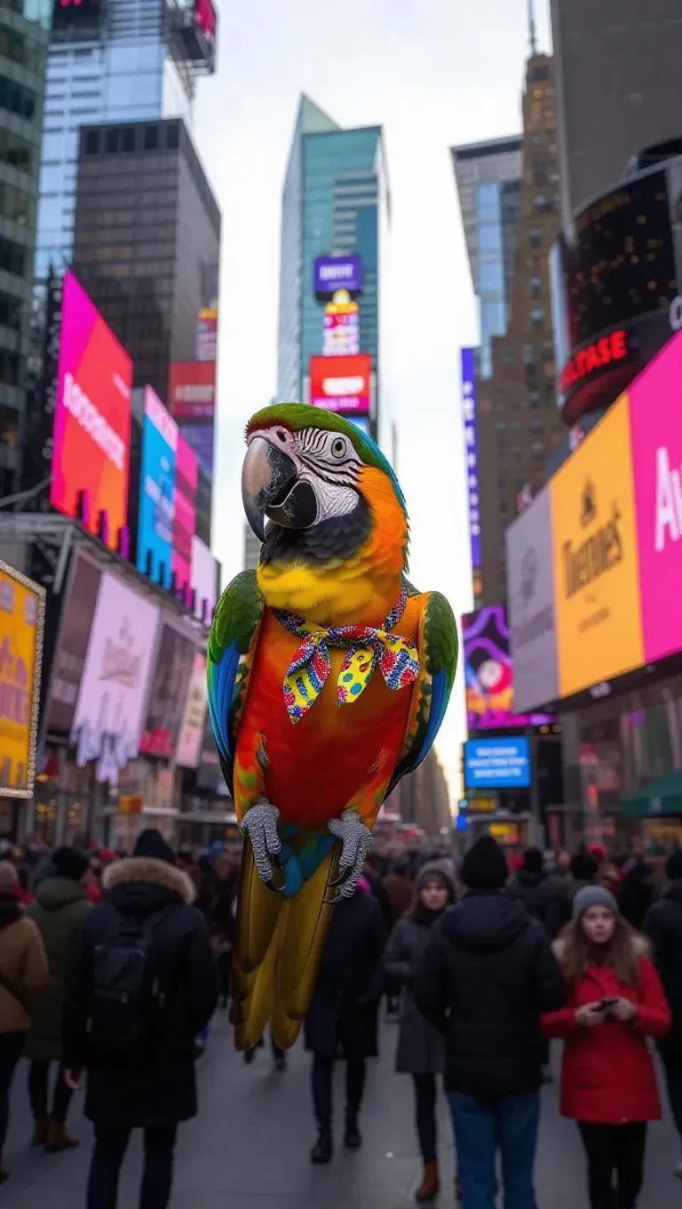 A lively parrot flits through the colorful streets of New York City, USA, its claws holding onto a vibrant feather. The parrot sports a small aviator goggles and a bright bandana, its eyes gleaming with excitement. Surrounding it, towering signs and energetic crowds create an engaging atmosphere. In the distance, the iconic Rockefeller Center stands proudly, its statue visible against the glowing skyline. The air is filled with the scent of street food and the hustle of subway trains.