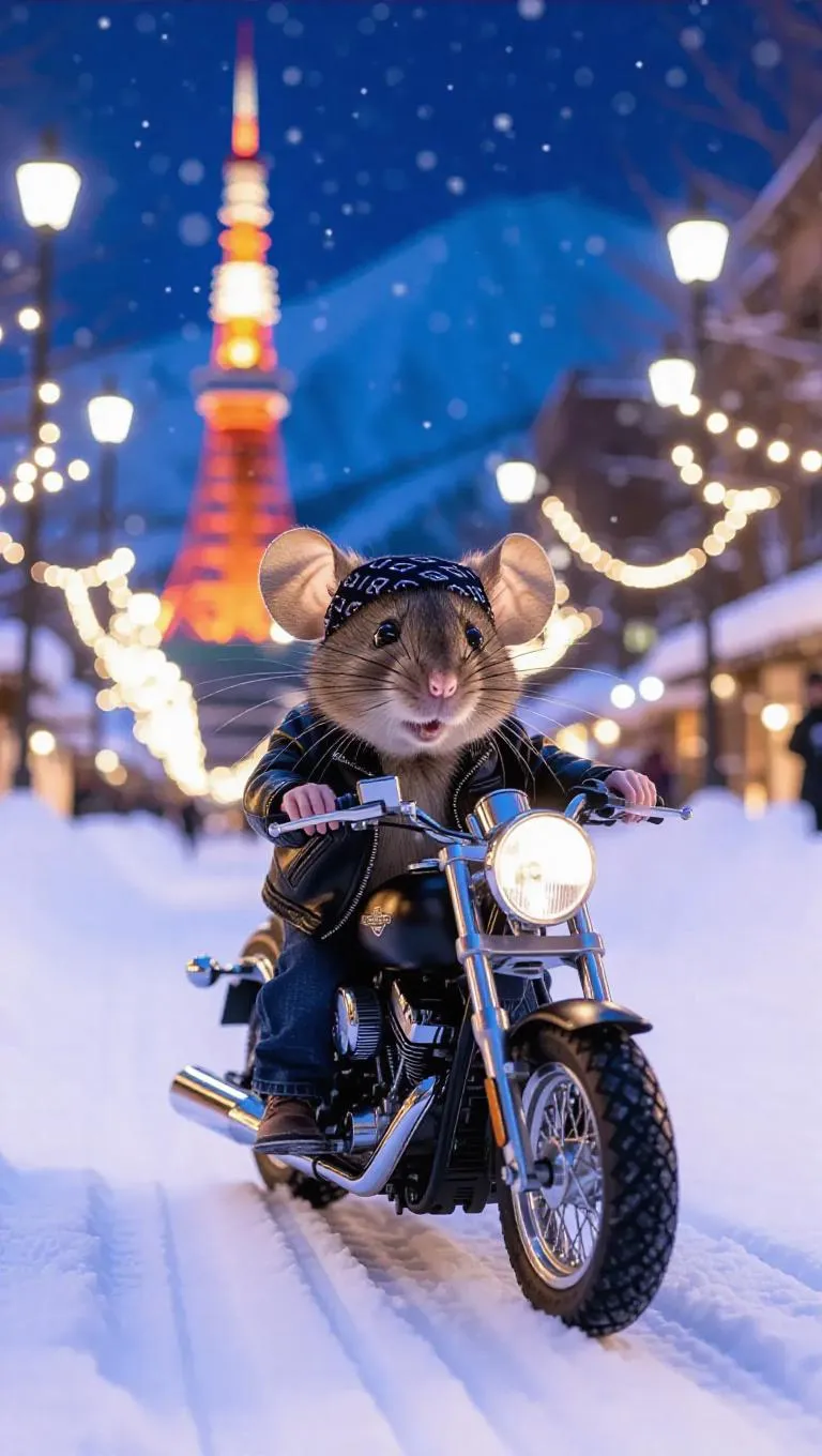 A daring mouse steers a pocket-sized motorcycle through the energetic sights of Sapporo, Japan, its tiny hands gripping the handlebars tightly. The mouse is outfitted in a leather jacket and a bandana, its cheeks puffed with excitement. Surrounding it, snowy landscapes and twinkling lights create a magical environment. In the distance, the Sapporo TV Tower rises elegantly, its form contrasting against the starry night. The air is chilled with the aroma of hot cocoa and the whispers of winter fun.