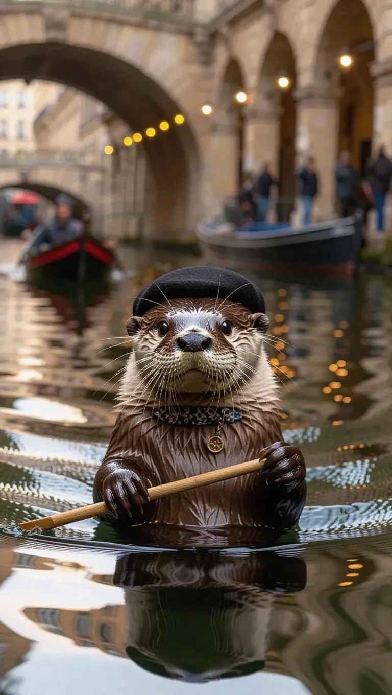 A mischievous otter floats through the canals of Paris, France, grasping a miniature oar in its paws. The otter is adorned with a beret and a patterned neckerchief, its agile body moving gracefully through the water. All around, classic buildings and beautiful arches line the waterways, their reflections dancing in the canal. Nearby, a classic boat sails gently by, its fairy lights twinkling. The air buzzes with the sounds of street musicians and the rhythmic sound of water lapping at the sides of the vessels.