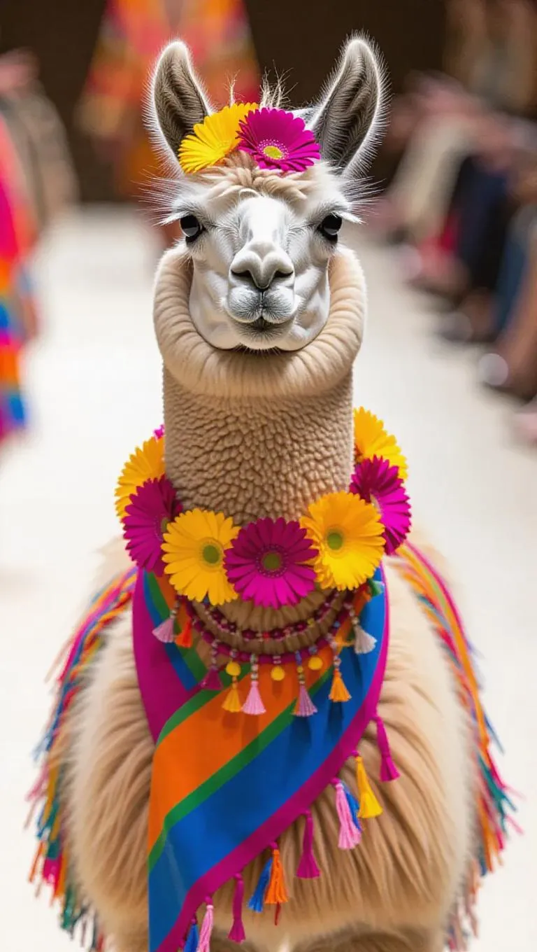 A stylish llama struts down the runway, its long fur flowing with each step. It dons a flower necklace around its neck and a colorful scarf draped over its shoulder, adding a vibrant flair. The llama's calm hum and graceful presence create a serene atmosphere.