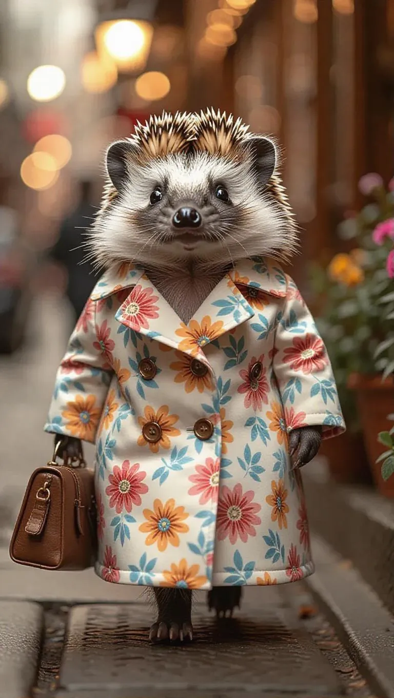 A vibrant T 台 scene featuring a delightful hedgehog walking calmly in a floral trench coat with a purse, carrying a fashionable carry-on, creating a cozy and inviting atmosphere.