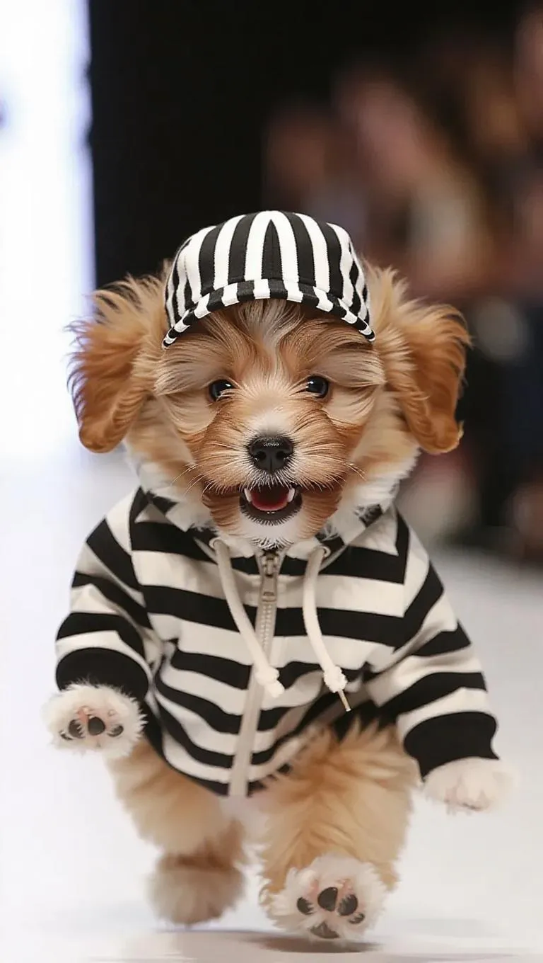 The fluffy puppy, wearing a striped hoodie with a cap, skips down the runway with an excited expression. The camera captures its lively leaps, focusing on the flapping cap and the puppy's wagging tail. The background transforms into a bustling fashion show, adding energy to the puppy's vivaciousness.