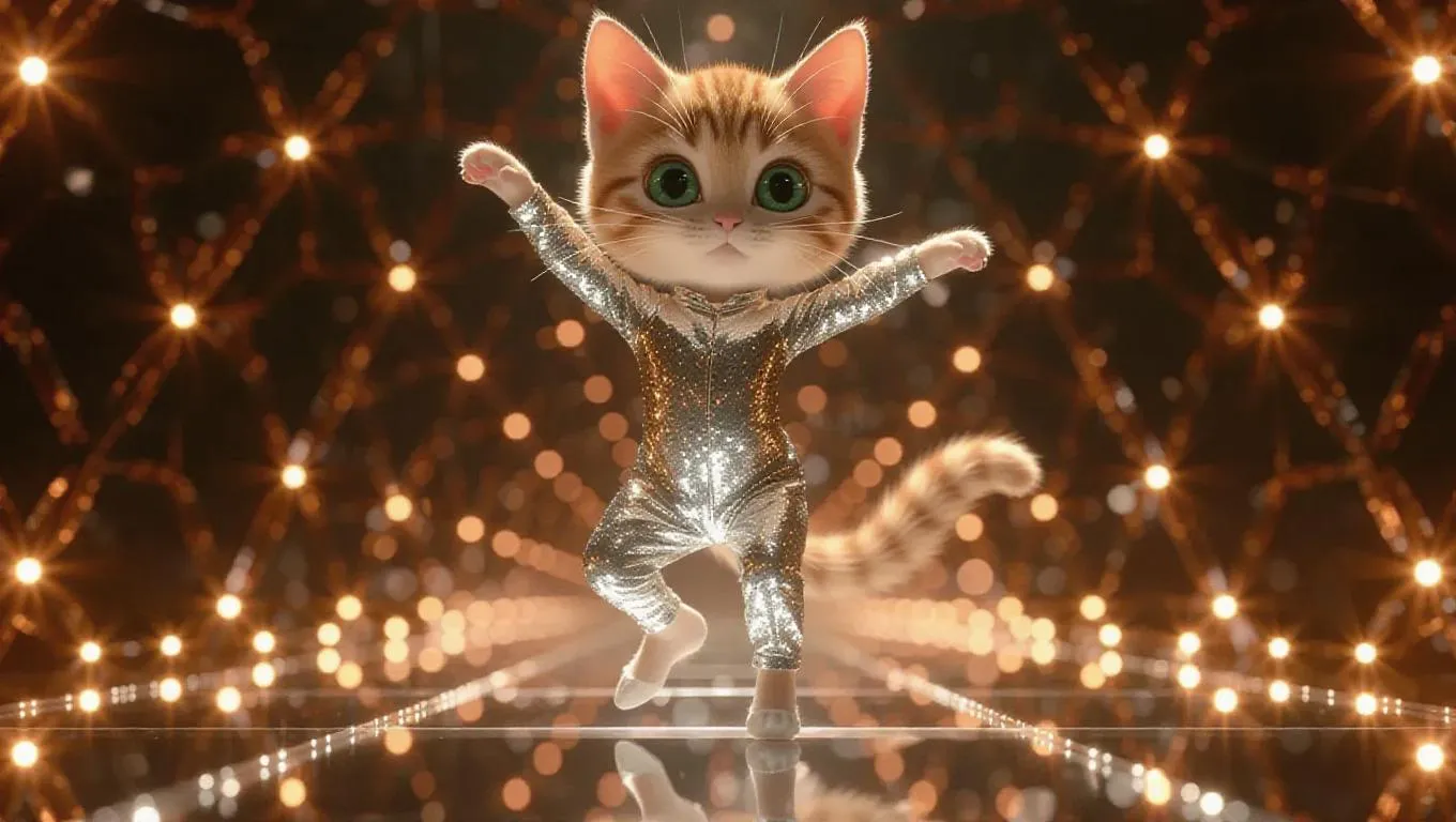Full body, tiny cute little cream tabby cat with seafoam green eyes, delicate eyelashes, blush on the cheeks, cute, cartoon, photorealism, dancing gracefully on a crystal runway, dressed in a lustrous silver jumpsuit with glowing coral accents, wearing chic white heels, striking a ballet pose, surrounded by shimmering sparkles.