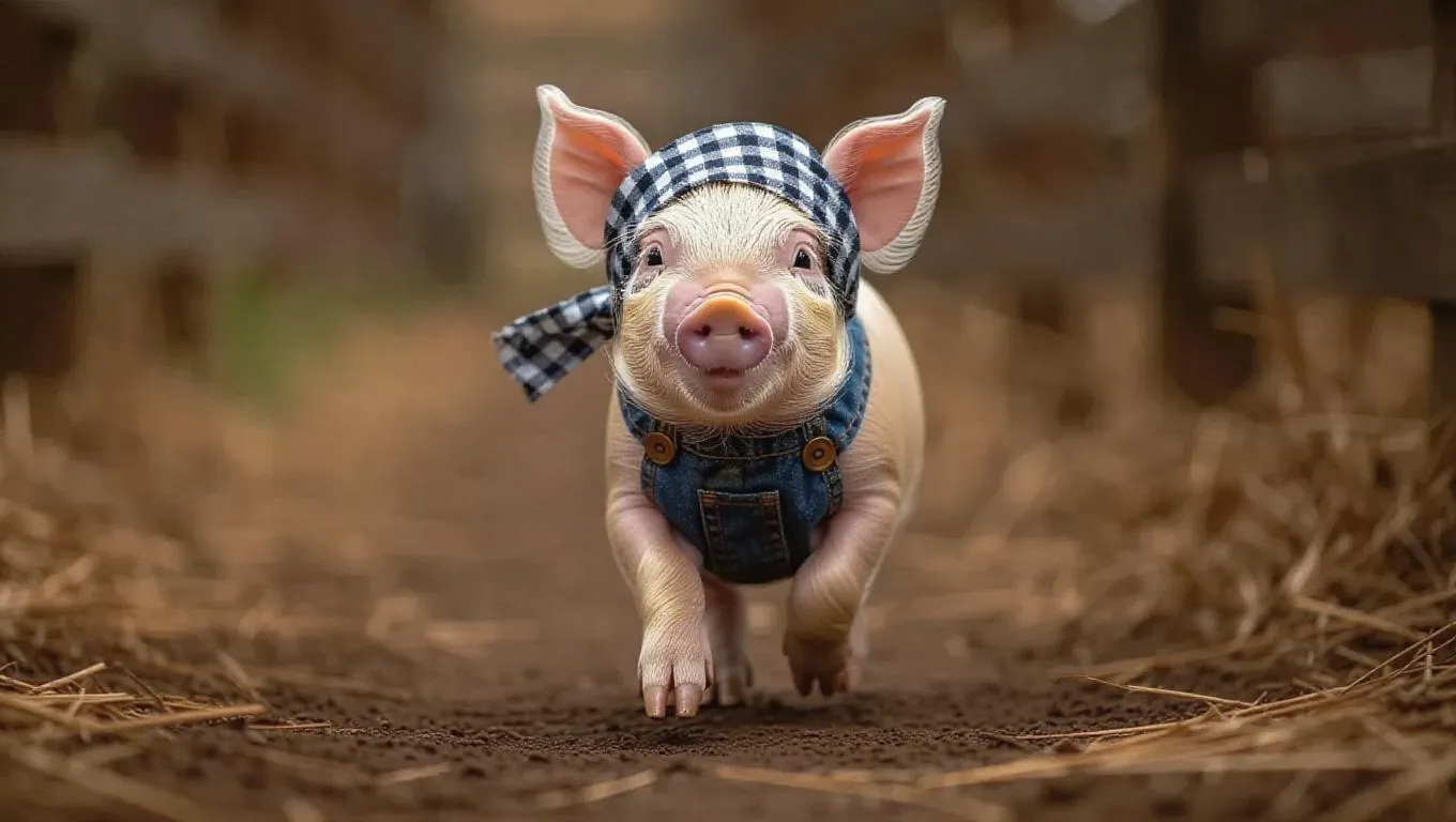 A tiny piglet frolics down a rustic farm-style runway, its curly tail wagging merrily. It wears a checkered bandana and denim overalls, creating a charming and down-to-earth vibe. The piglet's cheerful oinks and playful snorts amuse passersby.