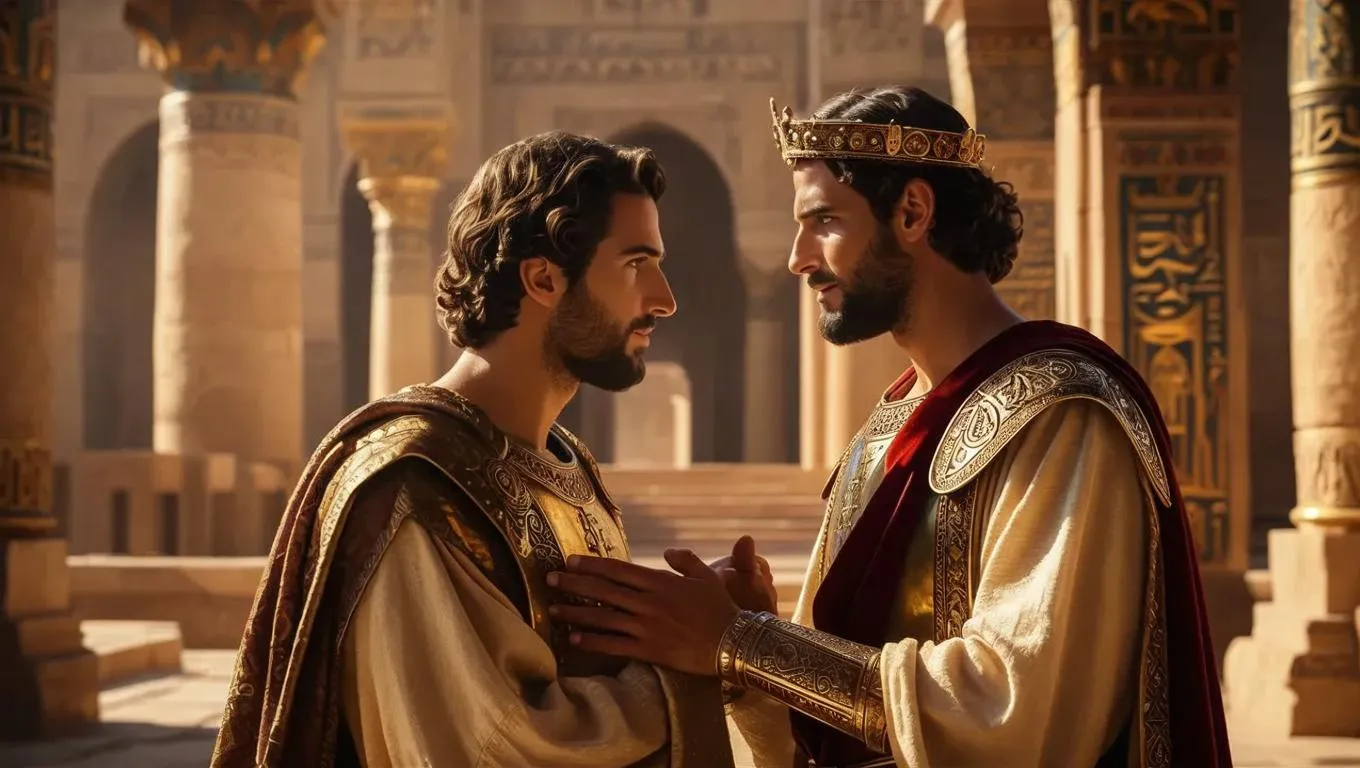 Experience the iconic bond of David and Jonathan in this AI-generated cinematic scene. Set in King Saul's opulent palace, their heartfelt conversation radiates biblical-era authenticity with high-contrast visuals and lifelike realism. Elevate storytelling with vivago.ai's professional-grade AI effects for immersive historical narratives.