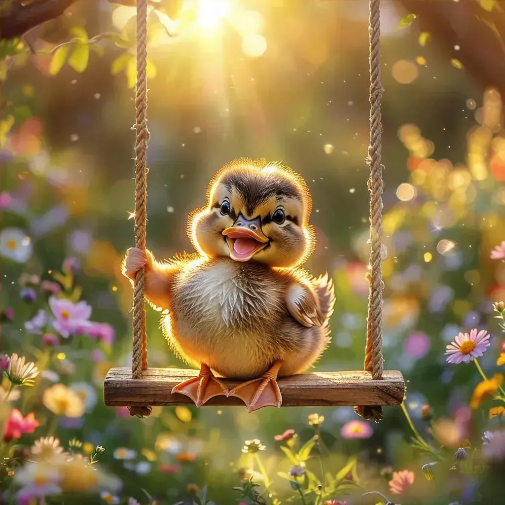 Create a whimsical AI-generated scene of a fluffy, joyful duck swinging in a vibrant garden. Sunlit flowers, dancing petals, and rustic charm blend into an enchanting, dreamy atmosphere. Perfect for lively visuals with vivago.ai's AI art tools.
