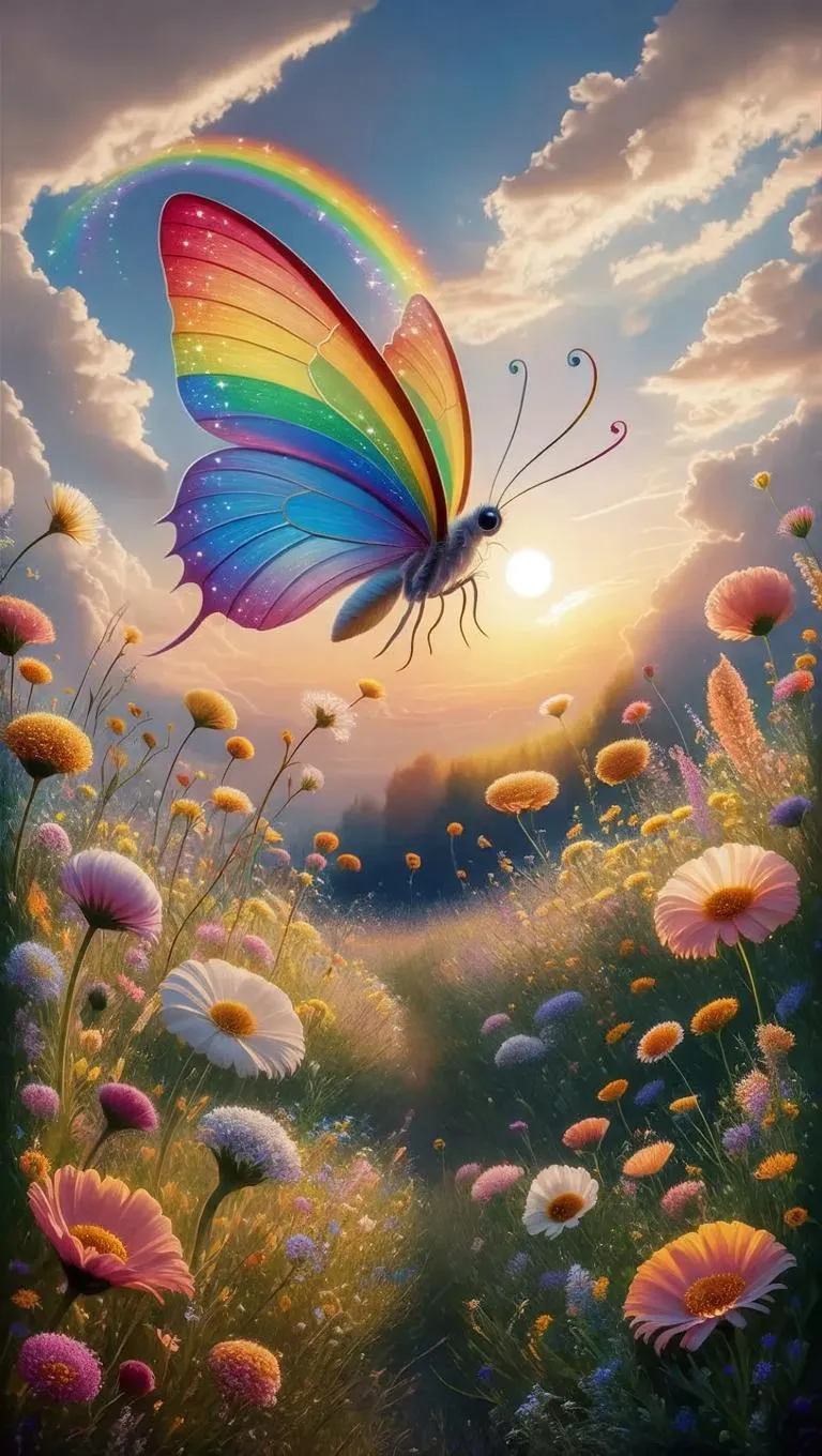 Vibrant AI-generated image of a rainbow-hued butterfly fluttering over a colorful meadow, shimmering wings blending with blooming flowers under golden sunlight. Dreamlike nature scene crafted with vivid details for surreal, whimsical visuals.