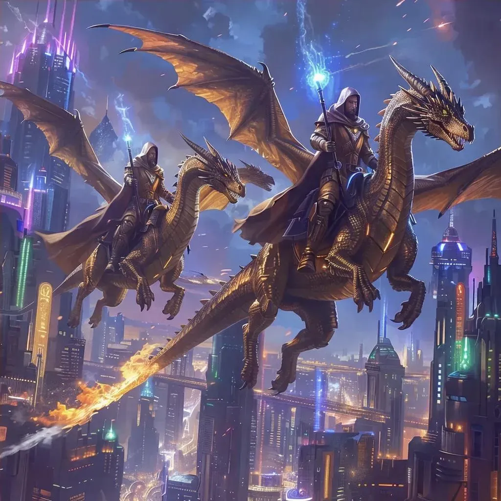 AI-generated artwork of cybernetic bronze dragons with fiery eyes soaring through a neon-lit dystopian metropolis, ridden by cyborg wizards casting arcane spells. Experience the fusion of ancient magic and futuristic technology in this cyberpunk scene, crafted with AI image generation tools for stunning, high-tech visual effects.