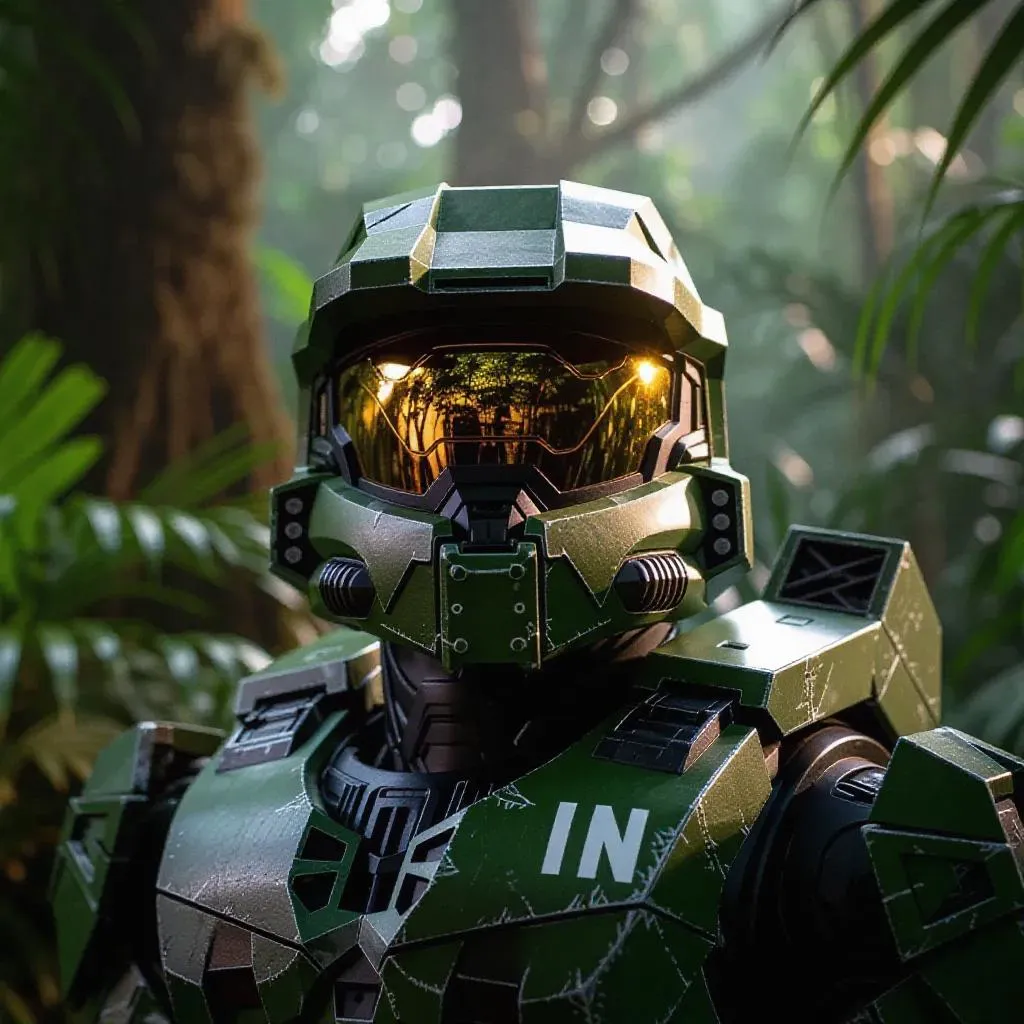 Generate a striking AI image of Master Chief's helmet in a lush jungle setting. Perfect for gamers and sci-fi fans, this prompt combines iconic Halo armor with vibrant wilderness backdrops. Use Vivago.ai's AI tools to create immersive, high-resolution visuals blending futuristic design and natural environments for wallpapers or concept art.