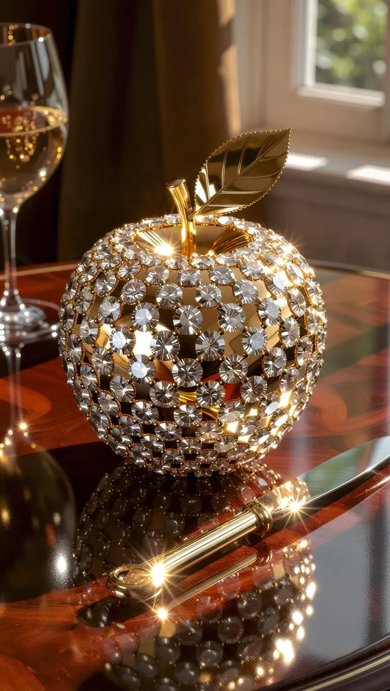 On a polished mahogany table rests a life-sized golden apple encrusted with shimmering diamonds, each facet catching the light. Beside it, a gleaming silver knife awaits to slice through the luxurious fruit. Soft window lighting highlights the intricate lattice of diamonds and smooth metallic surface, casting delicate reflections on the dark table. Close-up shot, ultra-detailed, photorealistic texture showing every gemstone’s refraction and gold’s subtle imperfections. Shallow depth of field blurs the velvet-lined wooden background, emphasizing the apple’s opulence. 8k resolution, cinematic volumetric glow, hyper-realistic rendering style.