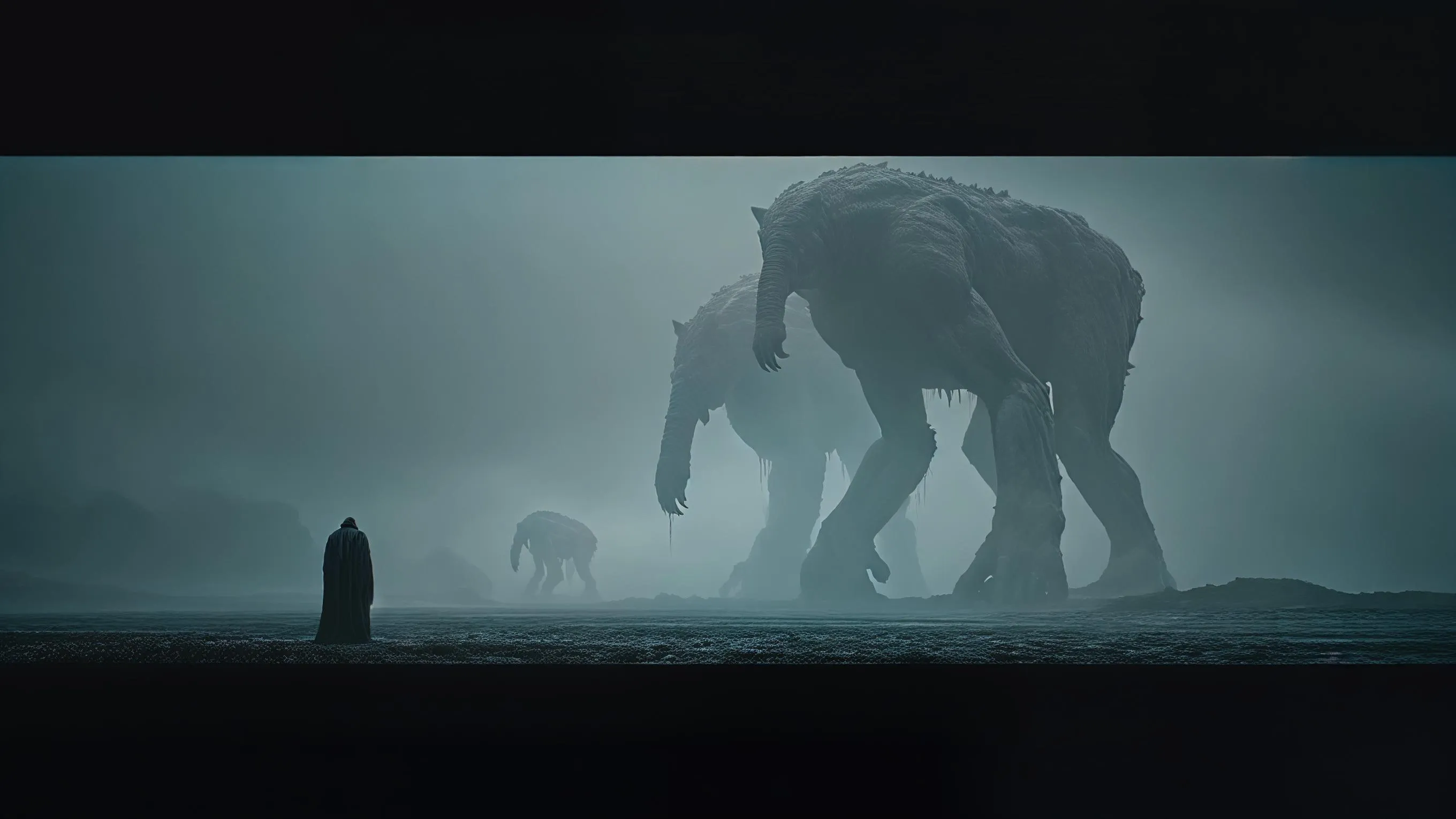 Create dark cinematic mythological art with vivago.ai. Generate AI images/videos of giant beings erased from reality, fading into dust and shadow. Depict a scarred, quiet world conveying necessity and finality. Professional AI effects for stunning 16:9 visuals without text. Transform prompts into epic visual stories.