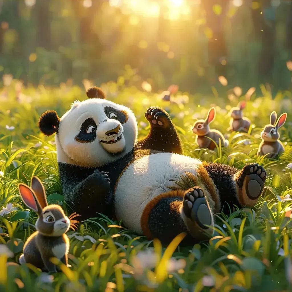 Discover a vibrant 3D animated grassland scene with a tranquil Pixar-style panda lounging among playful rabbits. AI-generated golden sunlight enhances the serene atmosphere, blending lush green grass and harmonious details. Perfect for whimsical storytelling or calming visuals—crafted by VivaGo.ai's AI tools for professional-grade, creative 3D animation and effects.