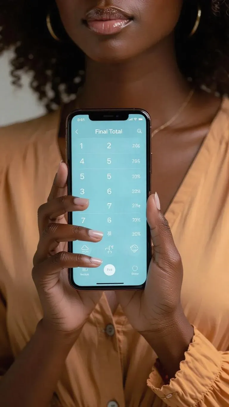 Generate AI images of a close-up view of brown skin hands holding a phone displaying a final travel total. Features soft slate blue tones and a calm, steady posture. Create professional visuals with Vivago.ai's AI tools.