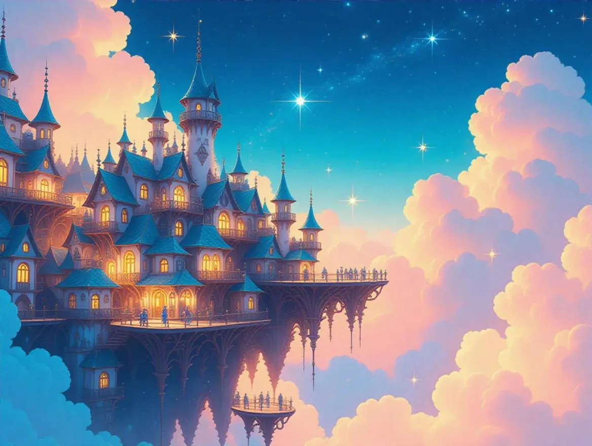 Little society living in the cloud, a whimsical and decorated beautiful town with small and happy people, abstract, sky full of stars, illuminated, kaleidoscope effect, cinematic, ethereal glow, floating platforms, pastel colors, dreamlike atmosphere.
